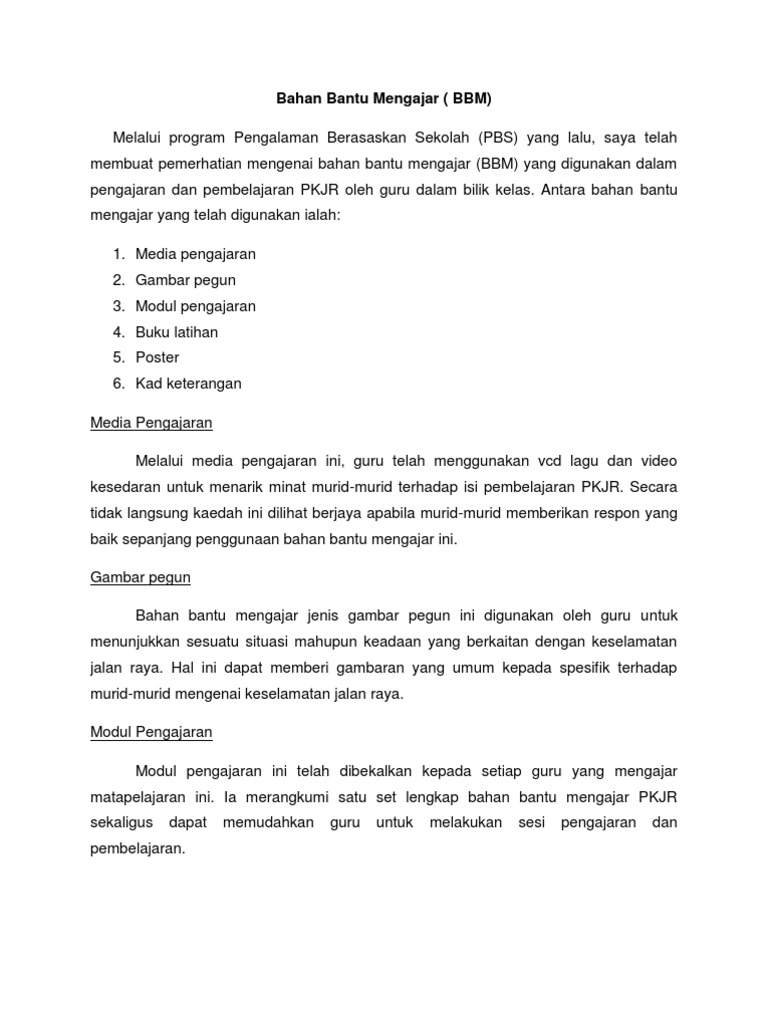 Penggunaan bahan bantu mengajar BBM dalam kalangan guru di sekolah memberi kesan yang positif terhadap kecemerlangan akademik pelajar dan kaedah pengajaran guru itu sendiri. Kumpulan tersebut bahan bantu mengajar yang asas papan hitampapan tulis buku teks dan buku kerja juga antara jenis bahan bantu mengajar Mat Nor Hussin 1988. Saiz bahan perlulah sesuai dengan kelompok murid sama ada pengajaran secara kelas atau individu dan bahan tersebut haruslah jelas supaya mudah untuk difahami.